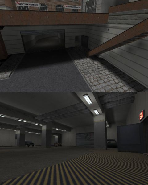 Besonderheit: Anzeige der Spieler, die sich in Tiefgarage befinden, durch rot blinkende Lampe überhalb der Treppe zum Bahnsteig