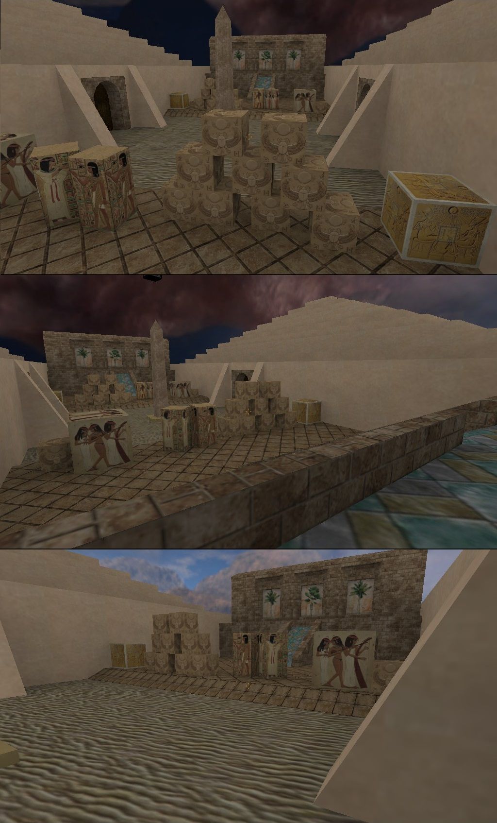 Eine kleine Fun-Map im ägyptischen Style. Beide Gegner stehen sich unmittelbar gegenüber. Der Aufbau der Map ist gespiegelt, damit jedes Team gleiche Chancen hat.