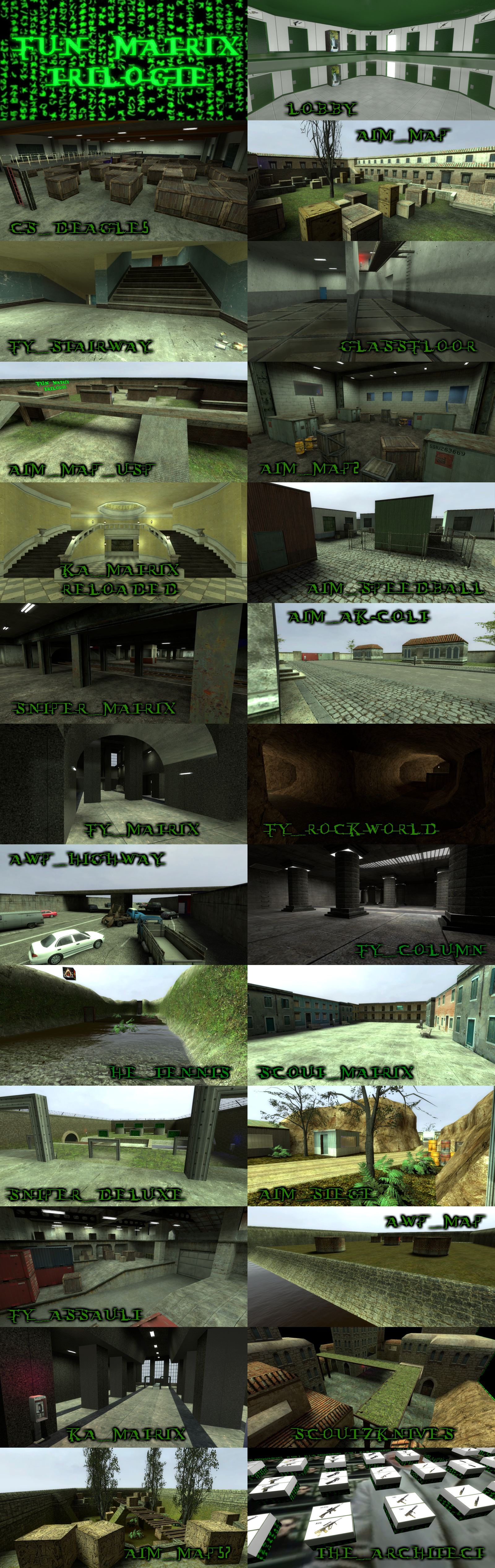 Die fun_matrix_trilogie besteht aus nur einer einzigen BSP-Datei und beinhaltet 23 Fun-Maps. Wie bei den alten Maps starten beide Teams jeweils in einem Raum, diesmal mit je 15 Türen.